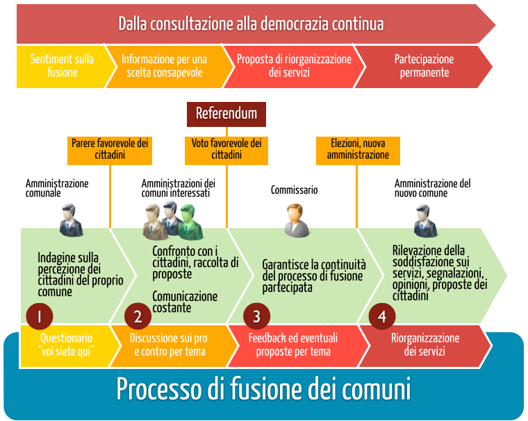 Il Consorzio dei Comuni Trentini propone agli Enti Locali interessati alla fusione un percorso costituito da 4 fasi, all'interno delle quali il cittadino viene costantemente informato, consultato ed attivamente coinvolto nel processo decisionale attraverso una piattaforma web per la partecipazione (ComunWeb ).