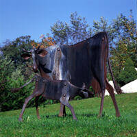 Quest'opera in ferro battuto, che rappresenta una vacca Rendena intenta ad allattare il suo vitello, fu realizzata nel luglio 1996 dal noto artista solandro Luciano Zanoni. Si tratta di una bella scultura che nella sua intrinseca semplicità e linearità rimarca e ripropone i sentimenti che legano la gente di Rendena a questa razza bovina. Un singolare omaggio alla natura rappresentata nella Razza Rendena, rustica e ben adattata a ambienti montani poveri e disagiati, e nel contempo un chiaro riconoscimento all'uomo, che con l'impegno quotidiano e la dedizione di chi non conosce feste o domeniche libere, si dedica alla salvaguardia del territorio e delle tradizioni.